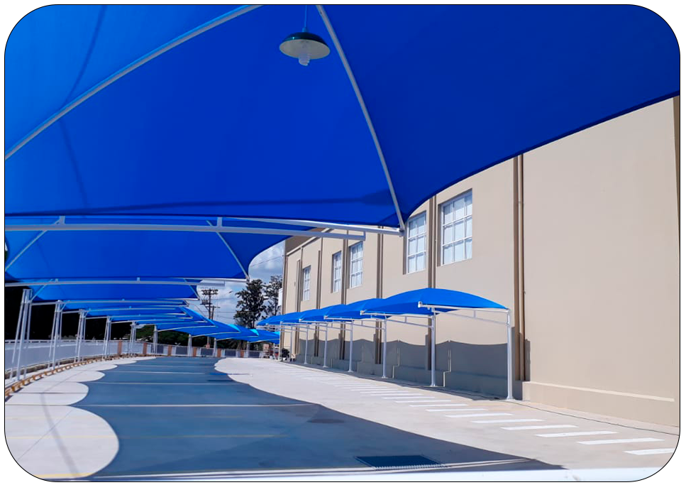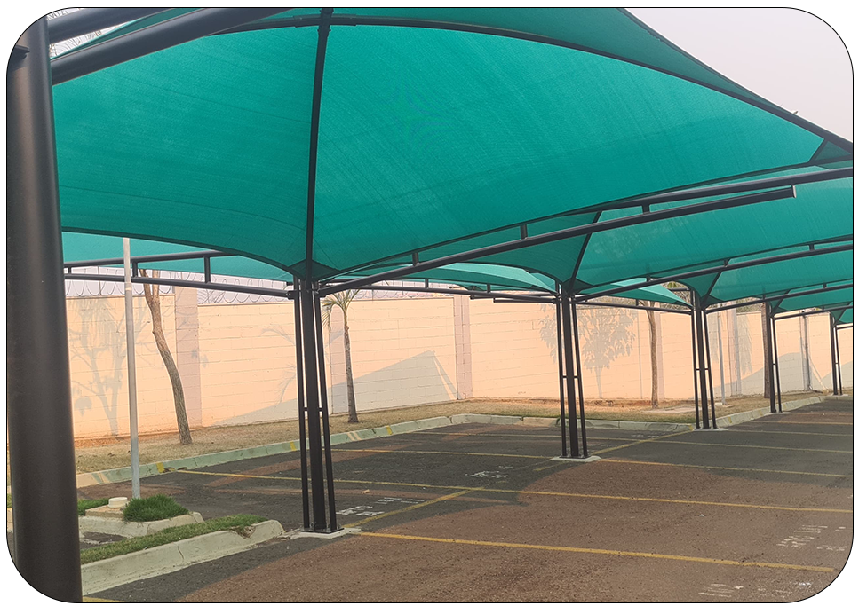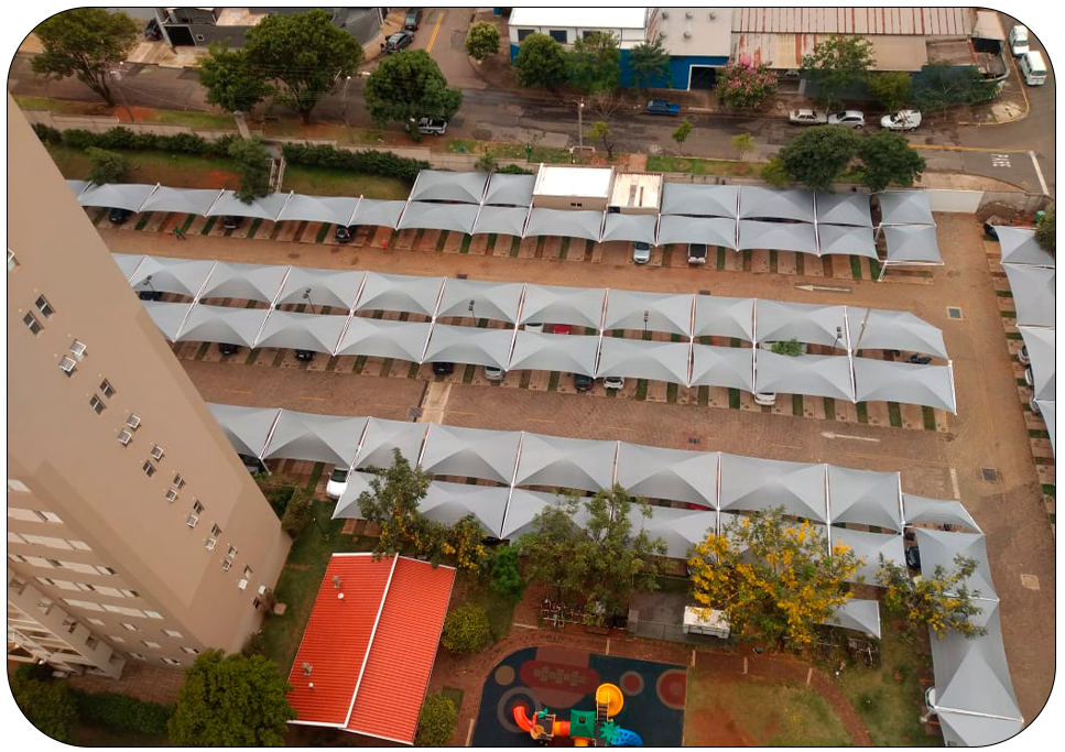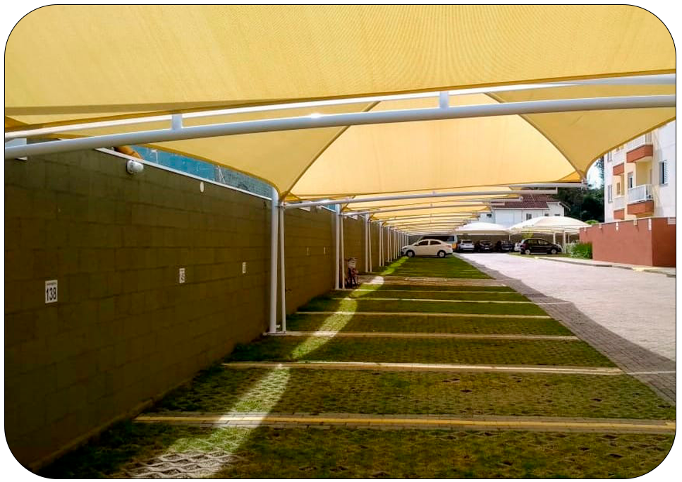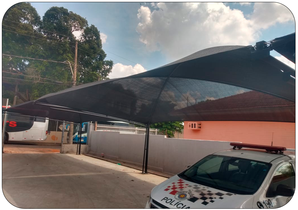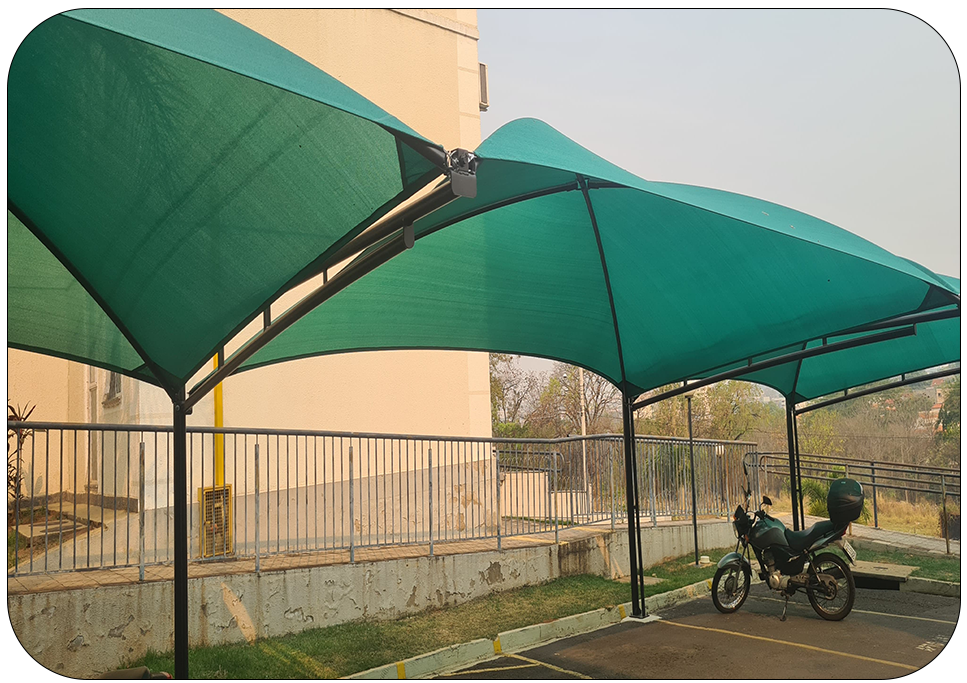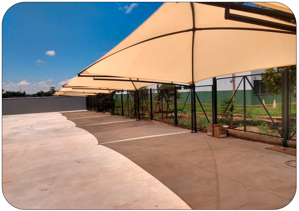 TELA DE POLIETILENO: As telas são fabricadas com polietileno de alta densidade, utilizando matéria-prima 100% virgem. Elas recebem aditivos especiais que as protegem contra raios ultravioleta, proporcionando resistência e alta durabilidade. As telas são sustentadas por cabos de aço galvanizados, os quais são tensionados e travados por catracas mecânicas. Além disso, os cabos são embutidos em barras costuradas com linhas reforçadas por resinas de bonderização nas bordas da tela, proporcionando uma instalação robusta e confiável.